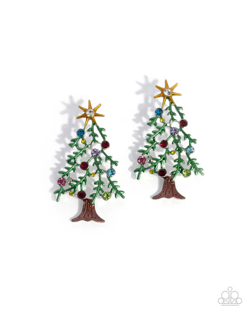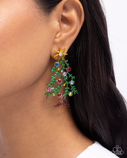 Featuring a Grass Green hue, airy pine needles embellished with multicolored rhinestone ornaments shimmers from a brown-painted stump for a Christmas Tree-inspired look. A gold star with a white rhinestone center tops the tree for a festive finish. Earring attaches to a standard post fitting.