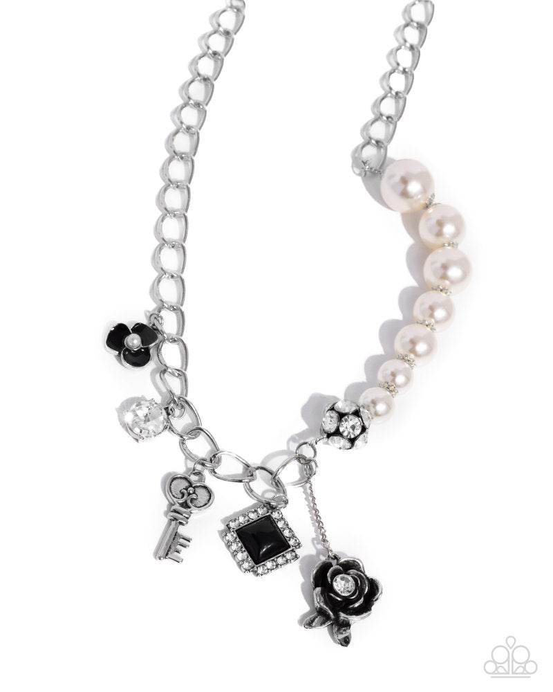 A strand of abstract silver chain links collide with white rhinestone-dusted silver ornaments in varying sizes, and glossy white pearls that gradually decrease in size along an elastic stretchy band to create an abstract blend of grit and glitz. Refined charms including a black-painted, pearl-dotted silver flower, solitaire white gem, textured silver key, rhinestone-bordered black square acrylic, and white rhinestone-dotted silver rose join along the silver links and cascade along the wrist for additional eye-catching detail.