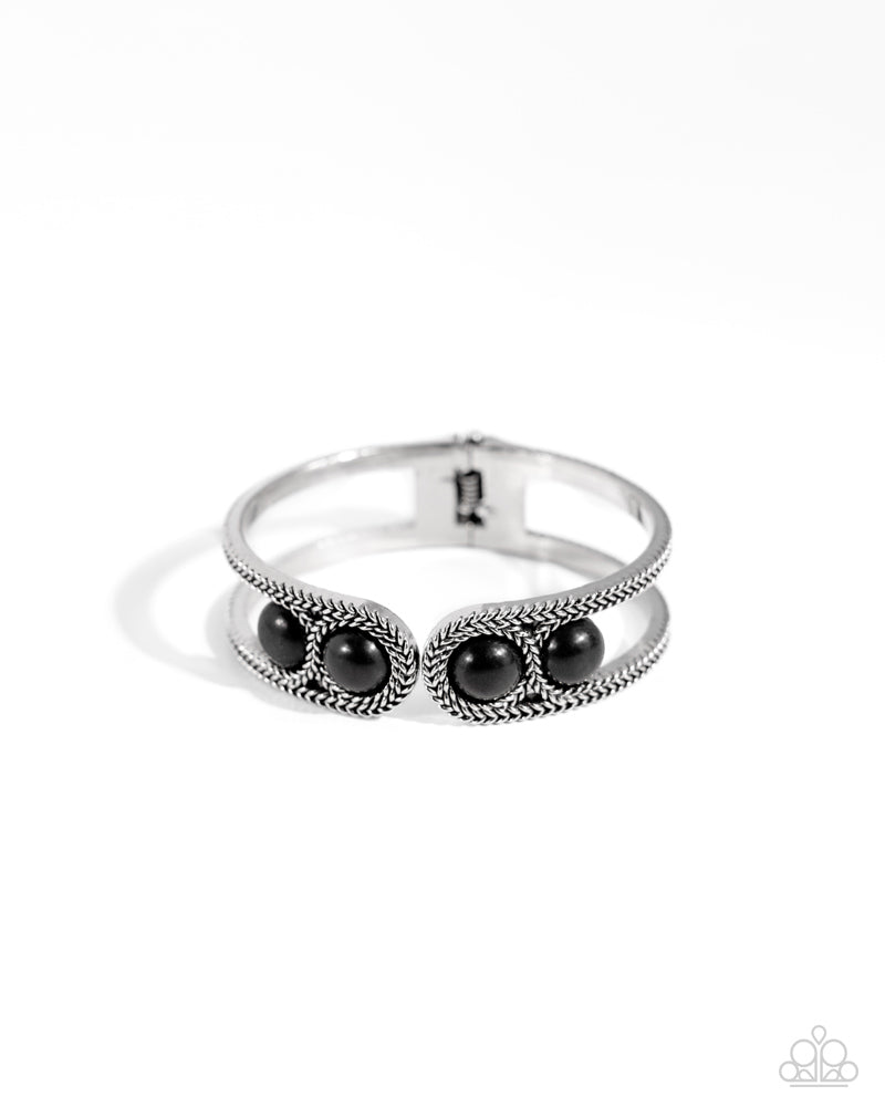 Featuring a chevron-like chain pattern, textured silver bars loop around pairs of bold black stone beads as they delicately hinge into a versatile bangle-like bracelet around the wrist.