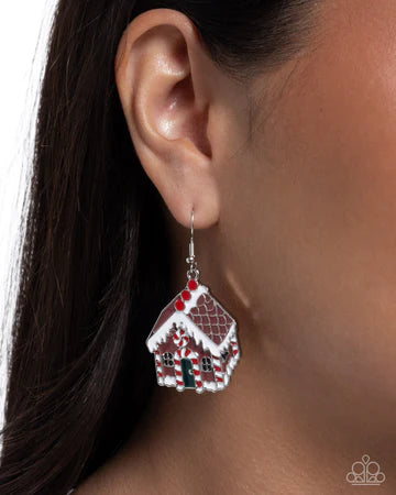 Featuring brown, red, black, and white-painted details, an ornate gingerbread house complete with various peppermint candies sways below the ear for a confectionary-chic, Christmas-inspired lure. Earring attaches to a standard fishhook fitting.