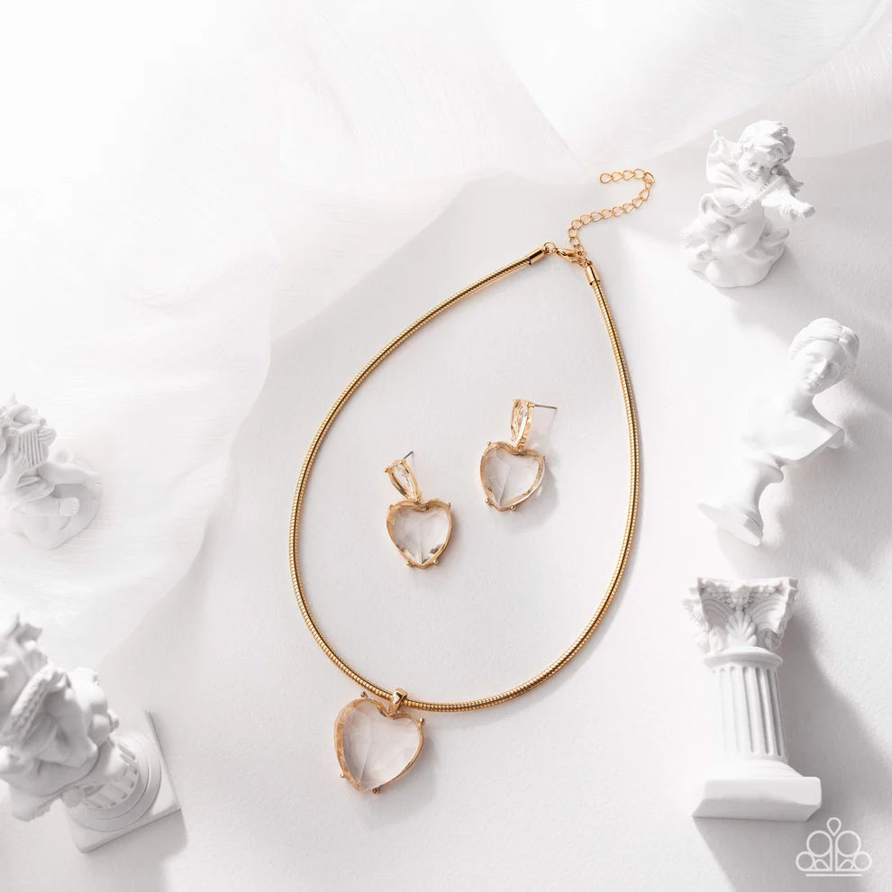 Pronged in gold fittings, a faceted, transparent heart-shaped acrylic swings along a glistening, gold cascade chain below the collar for a whimsical look. Features an adjustable clasp closure.