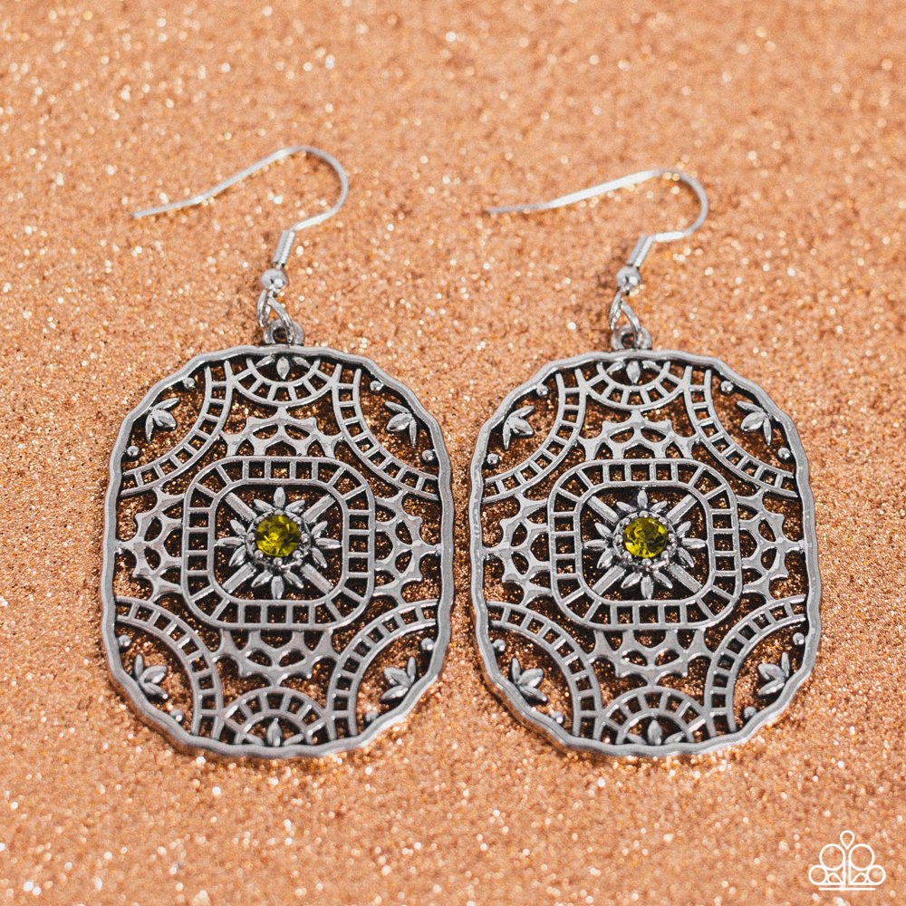 Dotted with a glittery green rhinestone center, a floral filigree textile motif blooms inside a daintily scalloped silver frame for a seasonal pop of color. Earring attaches to a standard fishhook fitting.
