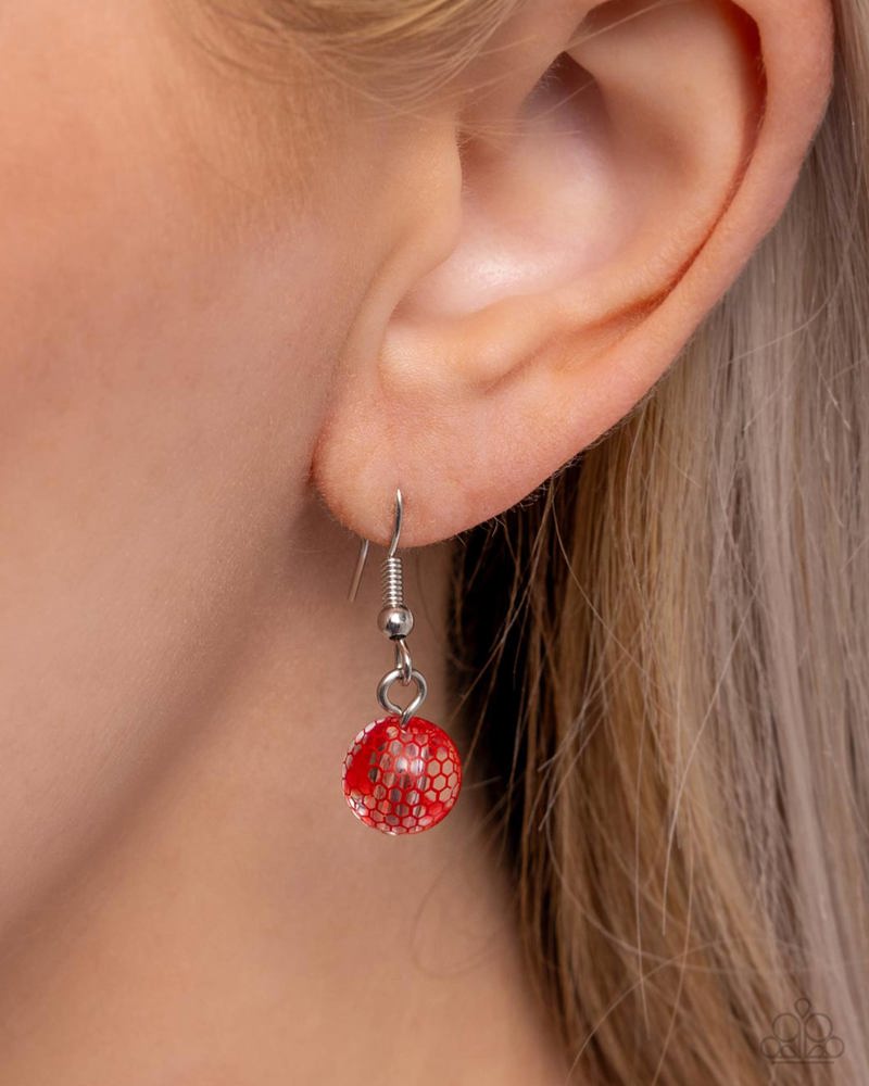 Attached to a black ribbon, a collection of red floral lace-covered beads gradually increases in size, sporadically interrupted below the neckline by glistening silver discs for an over-the-top vintage pop of color. Features a ribbon that can be tied at your desired length.