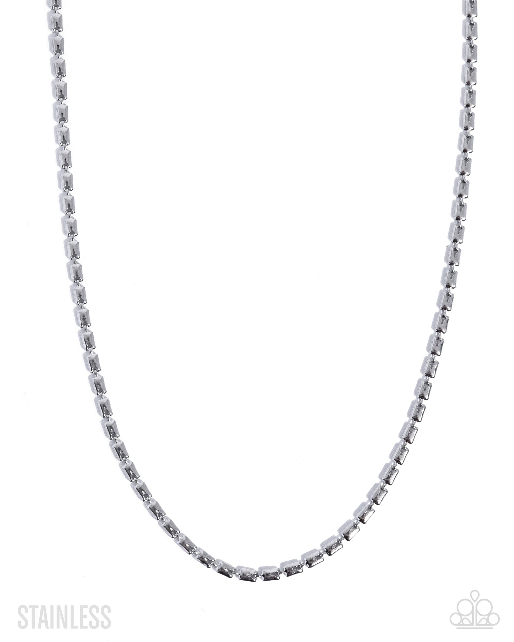 Featuring stainless steel, a glistening, oversized silver box chain cascades below the chest for a simple, serious look. Features an adjustable clasp closure.