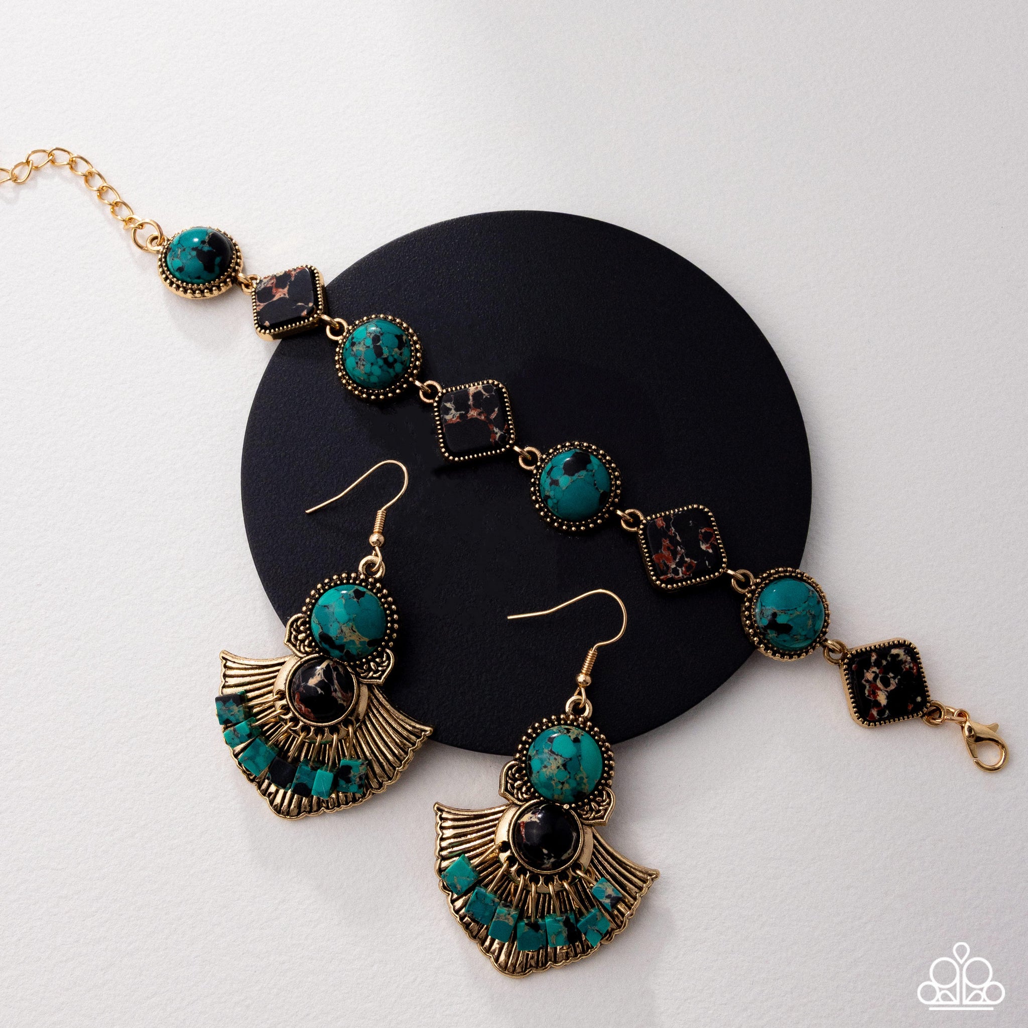 Featuring a marbled effect, a round green stone is pressed in an antiqued gold-studded frame, while antiqued gold spades fan out underneath it, leading the eye to its interconnected black-marbled stone in a sleek fitting. Suspended against a crimped, flared antiqued gold backdrop, a collection of green-marbled square stones sways below the black-marbled stone for a finishing touch of daring color. Earring attaches to a standard fishhook fitting. As the stone elements in this piece are natural, some color variation is normal.