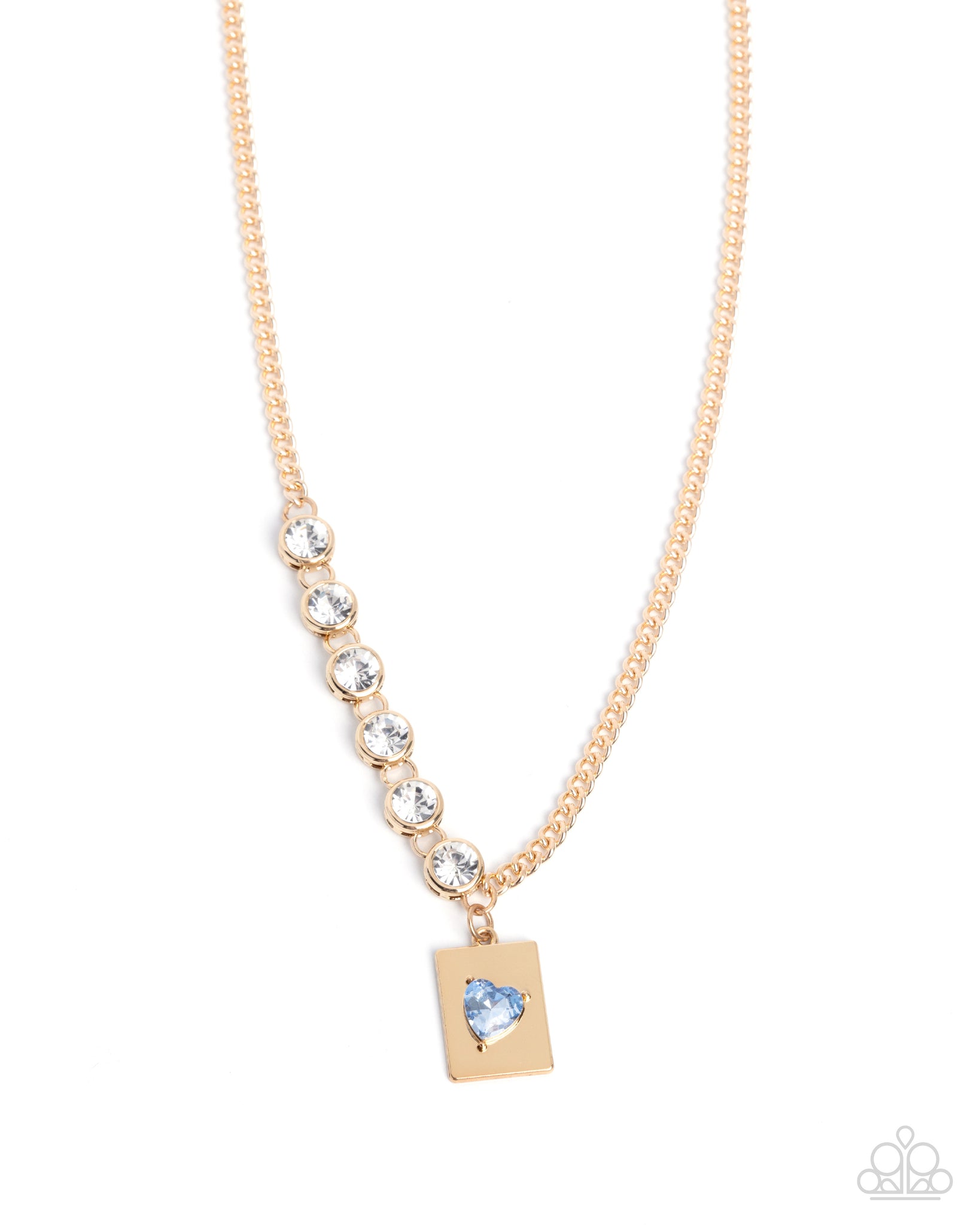 Pressed in gold frames, a collection of white gems intersects a glistening gold curb chain around the neckline for a contrasting chic display of grit and glitz. A blue heart gem is pronged in the center of a gold rectangular pendant for a fairytale-inspired flair. Features an adjustable clasp closure.