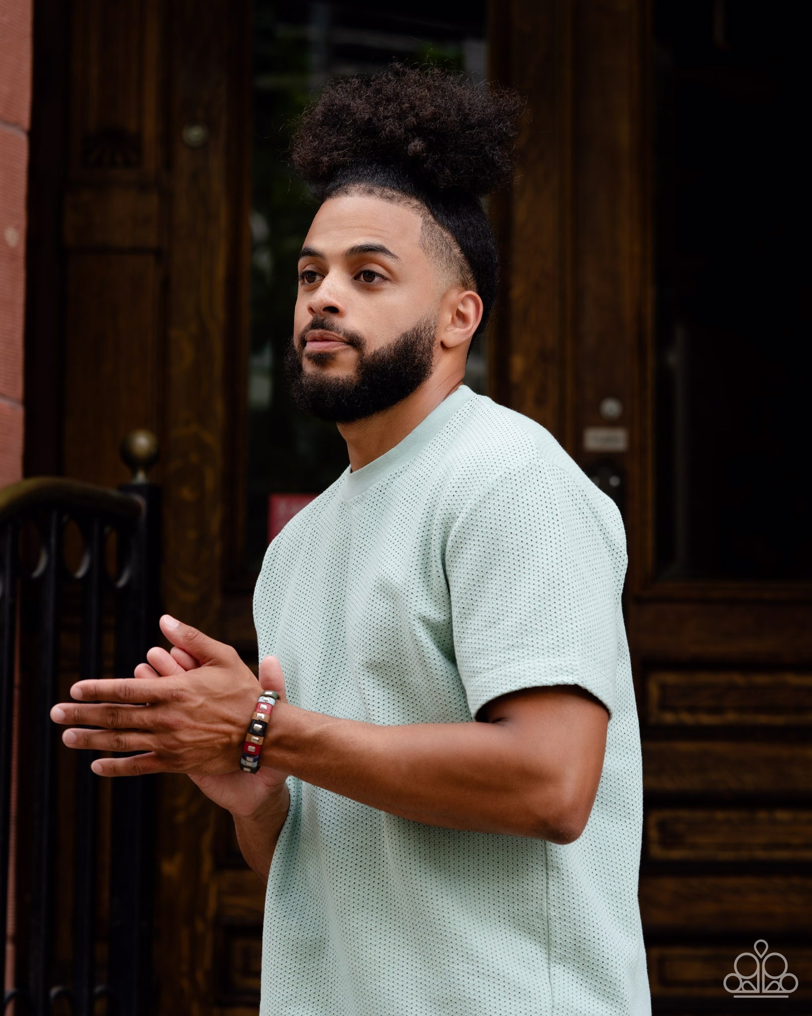 Sections of green, blue, red, brown, and black leather wrap around an urban brown leather band. Emerald-cut silver frames stud the centers of each multicolored suede band, adding a touch of industrial grit to the rustic display.