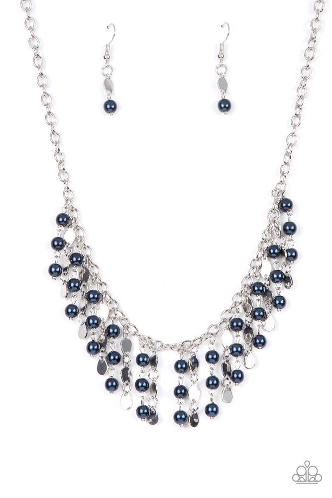 Tassels of stacked blue pearls and flat silver teardrops freefall from a classic silver chain, creating a timeless fringe below the collar. Features an adjustable clasp closure.